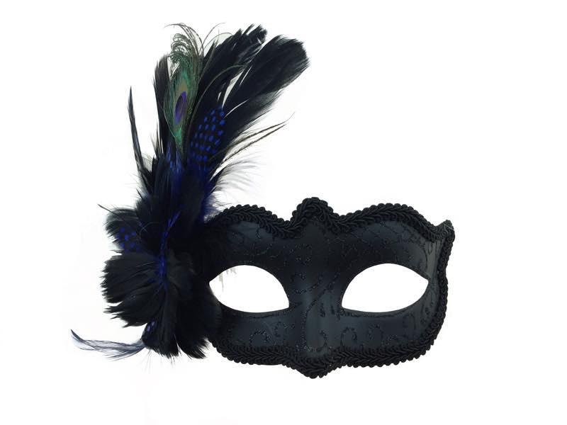 Venetian Black Mask with Peacock + Blue/Black Feathers
