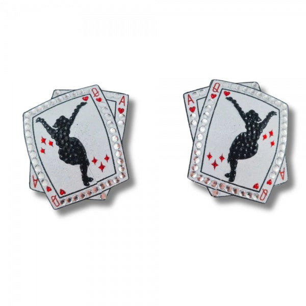 Get ready to raise the stakes with our stunning WILD CARD blackjack nipple pasties, a winning collaboration from Appeeling and burlesque legend Dirty Martini! These eye-catching pasties are a sure bet! The queen, of course, is none other than the silhouette of Dirty Martini, bestowing her glam on every fabulous piece! With a legacy that embodies boldness and allure, Dirty Martini brings her signature flair to this stunning creation, ensuring that each accessory will leave you with a winning hand.
