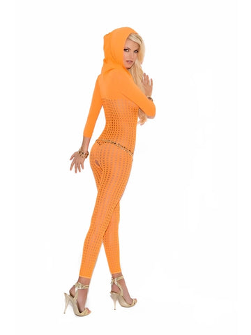 Crochet Bodystocking Lingerie with Hood - Neon Orange - One Size