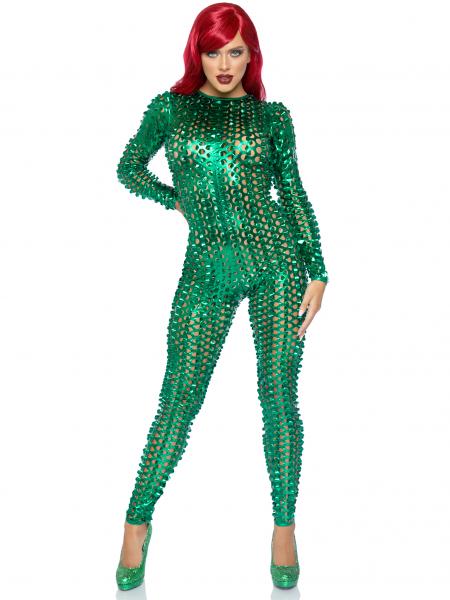 The laser cut metallic catsuit bodysuit for women by Leg Avenue is a sexy must-have basic for halloween costumes and to layer with festival outfits. Laser cut-outs create a naughty peek-a-boo affect that's sure to wow, and the long sleeved bodysuit can be used to create an amazing space costume, tin man costume and so much more! Zipper back for easy wear.