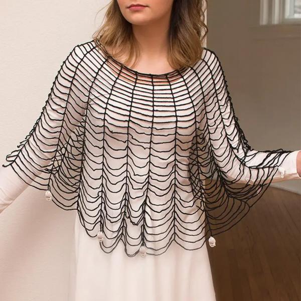 Get ready for a chilling night with this Gothic poncho. Whether you’re off to a party or staying home to hand out candy, the Gothic poncho is sure to showcase your Halloween spirit. Poncho features giant spider web design and hanging from the black, cotton webbing are hand-crocheted dimensional skull embellishments. You’ll be sure to scare up scores of compliments with this dramatic accessory.
