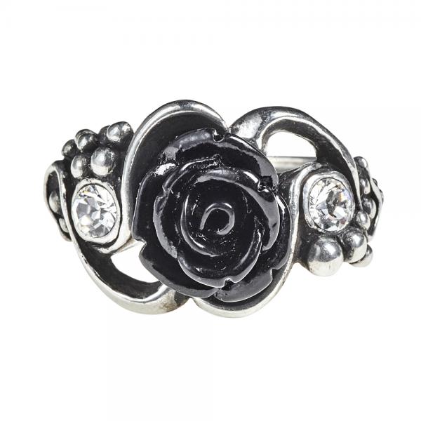 Polished pewter rose and grape vine ring, with black resin rose at its center and a clear crystal Swarovski gem either side.