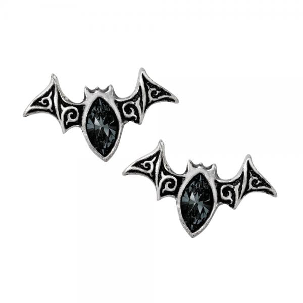 A pair of pewter ear studs in the form of small, stylized bats with vesica-shaped black diamond crystals; with surgical steel ear-posts.