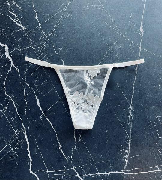 Simple G-string panty trimmed with satin. 3-d floral embroidery, adorned with pearl beads on a super sheer mesh base. Pair with the matching mini slip for the sweetest set!