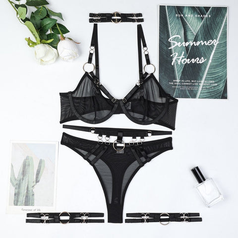 Unleash your bold side with the Obsession Strapped Sheer Lingerie Set, a daring and provocative design that commands attention. This four-piece set features sheer mesh fabric that teases the senses, paired with striking gold-tone O-ring hardware and bold straps for an edgy, seductive look. The underwired bra provides perfect support and lift, while the high-waisted panties and leg garters add a sultry, bondage-inspired flair.