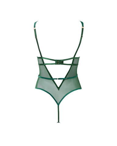 The Seraphim Embroidered Sheer Bodysuit in green is adorned with botanical lace detailing and unique wide-set straps. Structured boning, a high-rise fit and thong design make it a standout piece, while the open back with adjustable hook and eye fastening ensures a tailored fit.