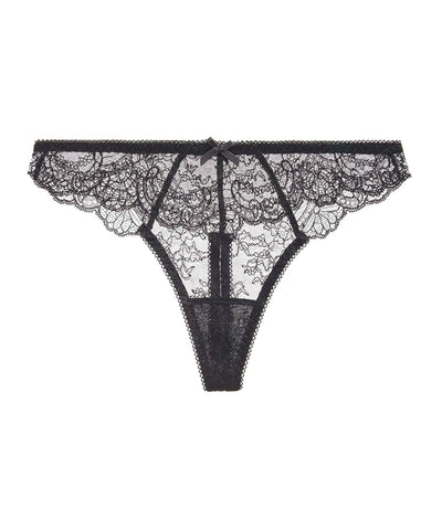 Feminine curves are delicately skimmed with refinement and lightness in the black shade of Danse des Sens. This tanga brief shows a hint of curves beneath divine scalloped lace that features at the top of the hips and on the small of the back.