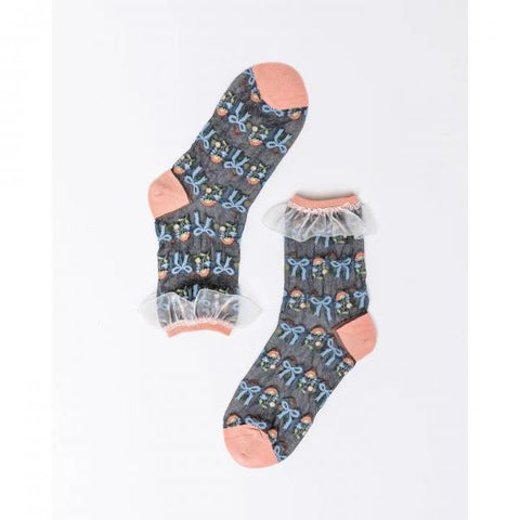 Floral Bow Ruffle Black Sheer Ankle Sock - US W5.5-10