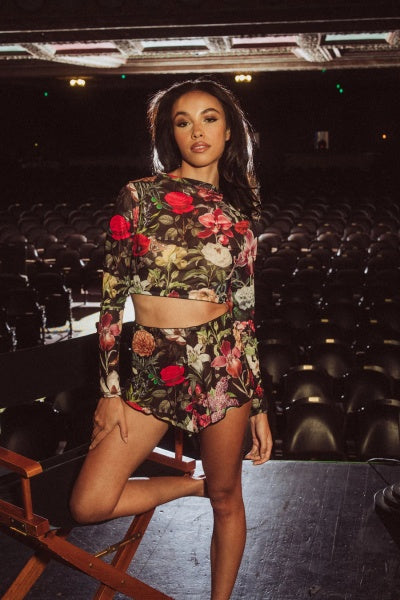 Long sleeve crop top made with stretch mesh digitally printed with our exclusive "garden of eden" print designed by KB featuring florals, butterflies, and hidden snakes. Elastic under bust for light support. Pair with the matching panties or shorts.