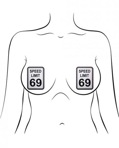 Speed Limit 69 Nipple Pasties by Pastease® are hand-made in the USA of soft form-fitting material that forms seamlessly to curves and resists wrinkling over hardening nipples. Just peel-and-stick pasties on clean, dry skin! All Pastease® pasties feature latex-free, medical-grade, waterproof adhesive that stays securely in place for as long as you like and until they are gently removed. Conceal or Reveal with Pastease® nipple pasties when worn with a sexy outfit, daring bikini, sheer top, revealing dress, Hefty bag, body lotion, crazy costume, party theme or nothing at all! Dimensions: 2.3 x 3 inches Coverage: 2.3 inches