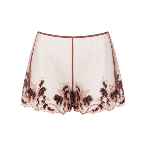 The embroidered lace showcases intricate detailing, while the sheer mesh provides lightness, breathability, and a flattering fit that moves effortlessly with the body. Light elastic waistband for comfort. Designed to pair perfectly with the Poème Tanga and bras from the same collection, these shorts complete the set with graceful sophistication.