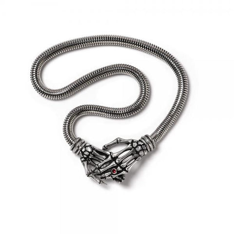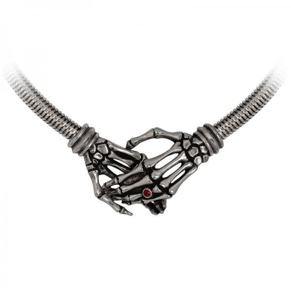 Mortal devotion, faith and trust must endure, to follow to the very end. This exquisite piece will be the extraordinary show stopper of any outfit! Polished pewter skeletal hands clasp together around your neck. Featuring an inlaid red Austrian crystal.