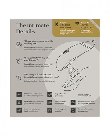 Womanizer PREMIUM 2 with the original Pleasure Air technology is our most luxurious creation yet - truly the Prada of sex toys, the ultimate toy for women who are looking for more than just another device to play with. With more intensity levels than ever before and an improved Autopilot function to take you on new, unpredictable adventures, PREMIUM 2 is the purest pleasure at the highest quality. 14 Intensity levels - Whether you prefer soft and gentle or powerful and intense, or something in between - your next orgasm is just the push of a button away. The intensity levels are perfectly balanced and offer the right setting for your every mood. Extra Stimulator Head - We know that every body is different and beautiful! For this reason, every box includes two sizes of stimulator heads to ensure that everyone can enjoy their WOMANIZER. Autopilot 2.0 - When active, your toy will alternate between intensity levels and keep you on your toes. Sometimes intense, sometimes gentle - always extraordinary. Our Autopilot mode was developed in response to feedback from our testers - an improved feature that users love. Smart Silence - Innovative Smart Silence Technology lets you indulge in your desire. The toy only starts when it meets your skin. If you're not using it, the toy goes into standby mode. This not only makes the toy quieter to use but keeps you in the moment without distraction. Materials: Body-safe silicone, made without phthalates, BPA or latex Dimensions: 155 mm x 50 mm x 35 mm USB rechargeable Run Time - 240 min Charge Time - 120 mins IPX7 Waterproof. Five Year Warranty through manufacturer.